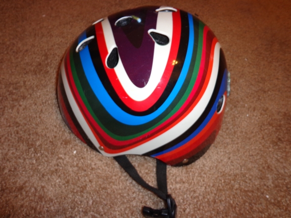 | My son's helmet, which resembles the "Moe Howard" design in some ways, but needs more ventilation |